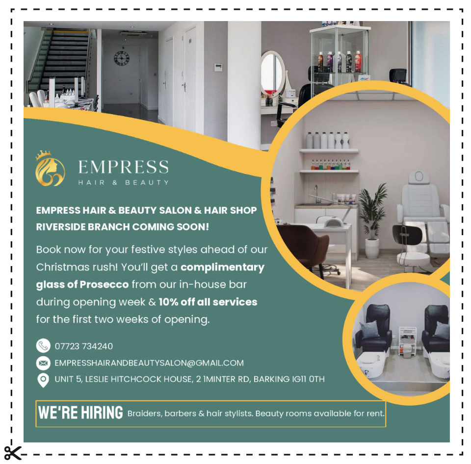 The new Empress Hair and Beauty salon will open this autumn at Unit 5, Leslie Hitchcock House, 21 Minter Road, IG11 0TH, opposite George Carey School, welcoming both new and returning clients to relax, refresh and feel empowered.